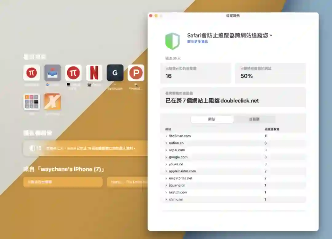 在起始标签页,Safari 增加了「隐私权报告」模块,这里会以周为时间单位更新报告,让我们了解过去七天有多少网站尝试追踪我们的个人资料,以及 Safari 拦截了多少对于隐私的追踪请求。