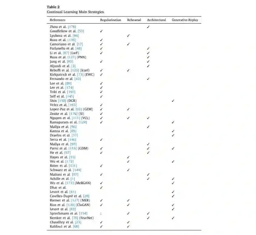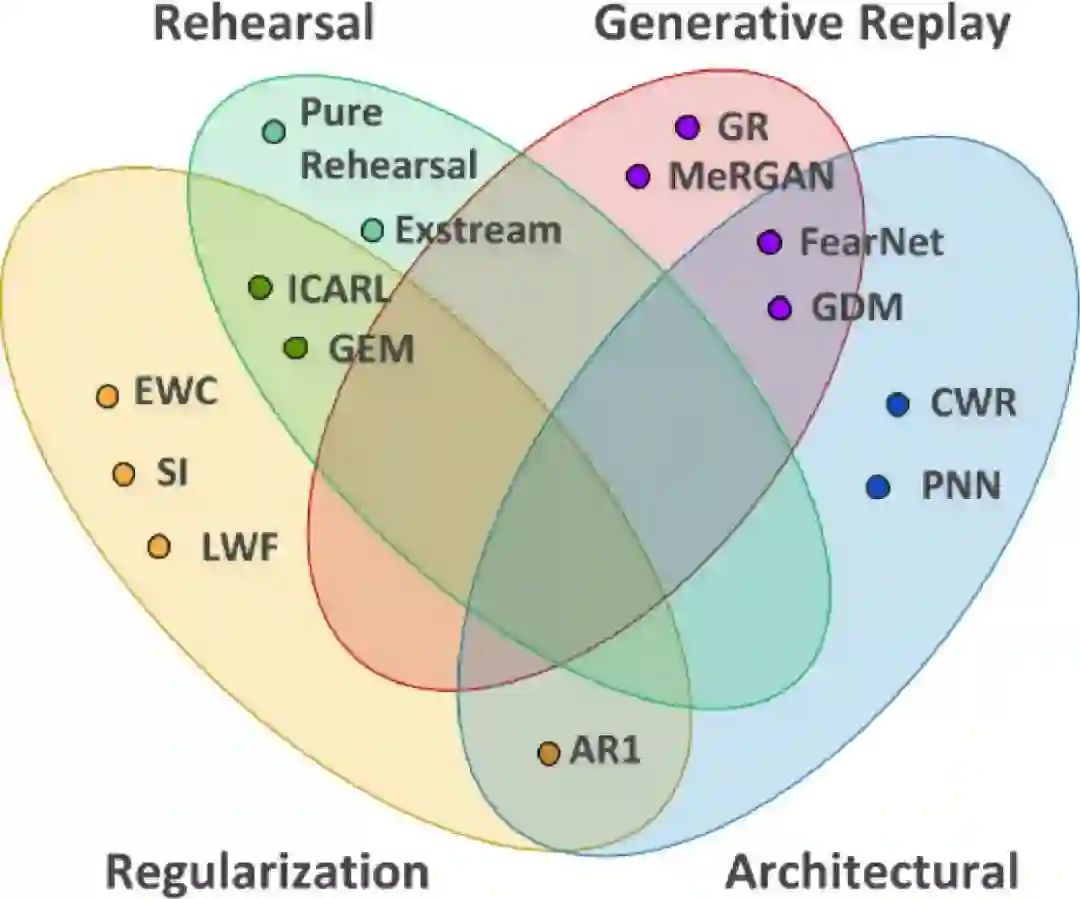 一些最流行的CL策略的维恩图。在第4节所阐述的四种方法中,CWR[91]、PNN[137]、EWC[73]、SI[176]、LWF[87]、ICARL[125]、GEM[92]、FearNet[70]、GDM[115]、ExStream[55]、Pure Rehearsal、GR[150]、MeRGAN[171]和AR1[97]。