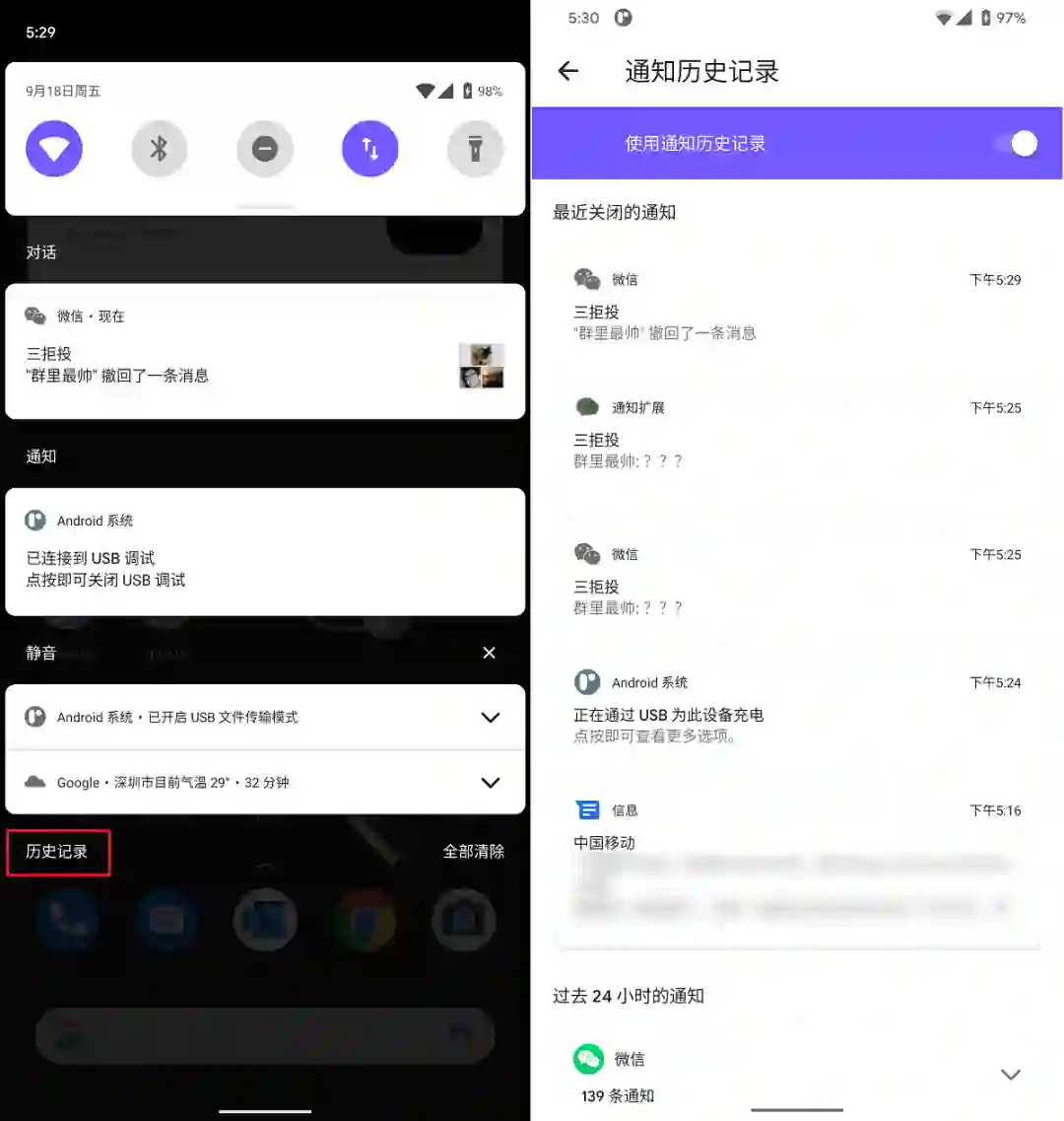 谷歌在系统通知的左下角设置了一个“历史记录”按钮,点击此按钮你就可以看到最近的应用通知历史记录,在App内被撤回的消息也会在此留下痕迹。