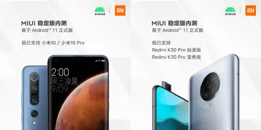 小米也通过官方微博宣布,小米10、小米10 Pro、Redmi K30 Pro标准版、Redmi K30 Pro变焦版已可申请基于Android11正式版的MIUI12稳定版内测。