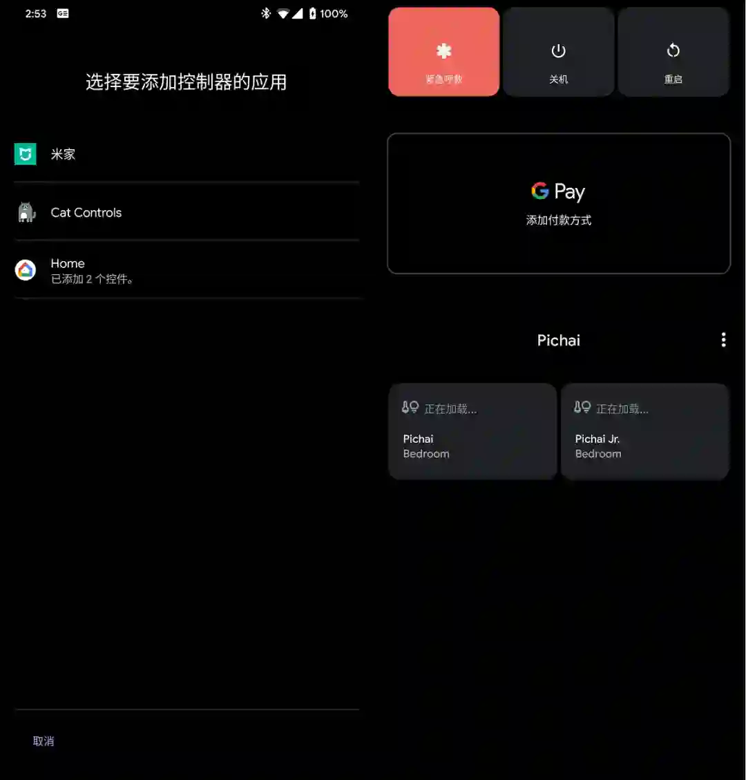 谷歌曾在Android 10上带来了电源键卡包设计,该功能在Android 11中得到进一步延伸,集成了智能家居设备的控制中心。