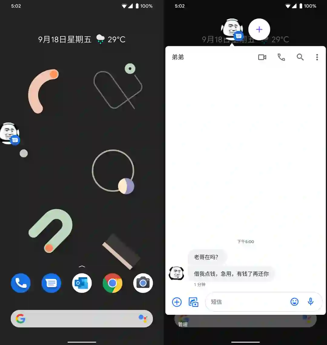 Android 11最引人注目的新功能当数对话泡(Bubbles)。这一功能于Android 10中首先推出,但在Android 11上得到了更广泛的应用。它类似与Facebook Messenger的对话泡类似,可以将一些正在进行中的对话以浮窗的形式显示。