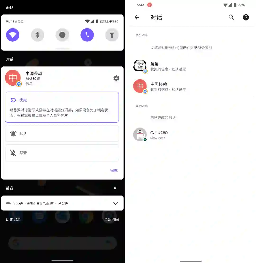 Android 11还增加了一个新的消息类别“对话”,在最顶层显示你的聊天信息,并增大了不同类别通知之间的间隔。谷歌还为对话消息提供了一个“优先级”的选项,可以将对话置顶。