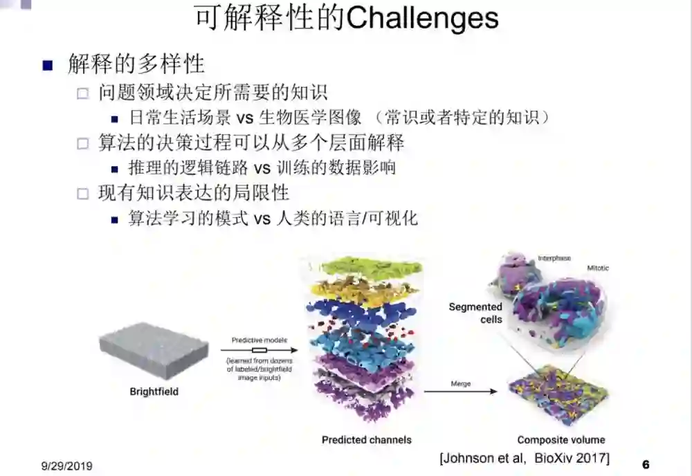 关于可解释研究的挑战,除了刚才各位老师讲的几个问题,我认为有以下几点。第一个是如何应用可解释到特定的实际问题,比如说从显微镜的图像里建立细胞的模型,这是一个生物影像的问题。我们发现生物学家很希望我们用深度学习的方法时都有一些可解释性。但特定领域的问题所需要的知识非常不同于日常生活场景,因为它们的层次是不一样的。第二,算法的决策过程可以从多个层面去解释,比如说是推理的逻辑链路,还是训练算法或数据集的不同对结果的影响?像刚才王井东老师说的,现有知识表达是有局限性的,因此算法学习的一些模式,是否能够映射到现有人类的语言,或者是基于可视化这种途径去解释,是不太确定的。第三,关于可解释性度量的问题,是否存在一个统一的度量方式?比如建立以信息论为基础的数学模型来度量,或者是在特定的应用场景下进行。