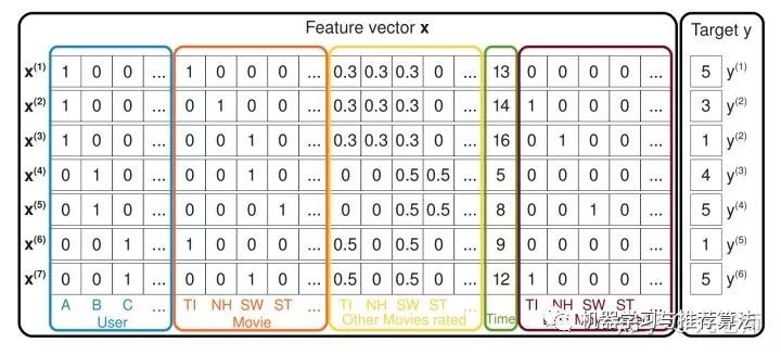 在MF的基础上,考虑推荐中的side information,如用户的年龄性别,物品的类目价格。用户和物品自身或属性称作一个field,field之间可以两两进行矩阵分解,这个被称作二阶项,类似BiasSVD考虑每一个field都有一个bias,这个被称作一阶项,再加上一个全局的bias项。这就是著名的Factorization Machines(FM)。