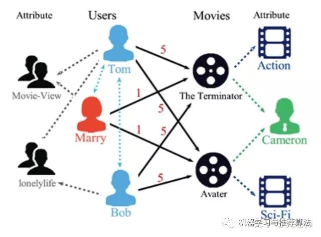 在用户和物品的二部图基础上,增加物品的属性作为顶点,建立新的边,就得到了一个异质信息网络。比如一个电影推荐系统,除了用户和电影外,还有导演,演员,电影类型,导演拍摄电影,电影属于某种类型,演员出演电影,导演与演员合作,诸如此类就能建立很多边。其中一类推荐算法叫做meta-path,通过专家经验人工挑选出一些图中路径,如用户->演员->电影,用户->导演->电影,这样的路径称之为meta-path,计算每一条meta-path的权重,将用户和物品间的所有meta-path联合计算评分。