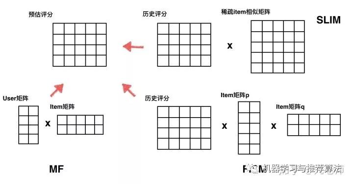 中该物品向量内积的和,这就是FISM算法。相比SLIM的稀疏处理,变为分解降维。最后再附上一张图,说明MF,SLIM和FISM之间的关系。
