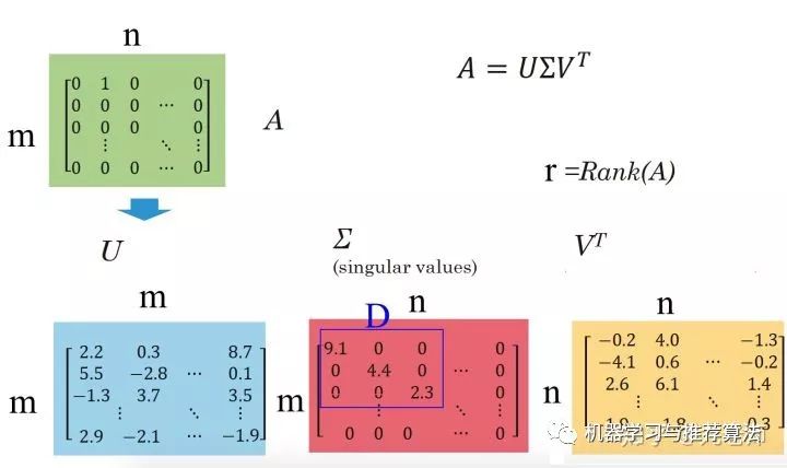 在矩阵视角下,很自然可以进行矩阵分解。SVD矩阵分解将n个用户m个物品的大矩阵分解成三个矩阵相乘,中间的矩阵越靠近左上角的特征值越大,代表矩阵分解的主要成分,也就是说保留左上角的 维矩阵D,其余的都置为零,将原来的等于变为约等于。将蓝色和红色的矩阵合并,得到一个