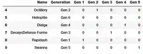 pd.concat([poke_df[['Name', 'Generation']], gen_dummy_features], axis=1).iloc[4:10]