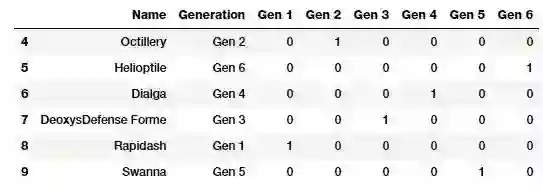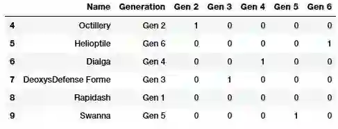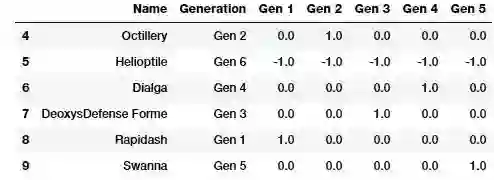 虚拟编码方案(Dummy coding scheme)与独热编码方案相似,不同之处在于,在虚拟编码方案中,当应用于具有 m 个不同标签的分类特征时,我们将得到 m-1 个二进制特征。因此,分类变量的每个值都被转换成 m-1 维向量。额外的特征将被完全忽略,因此如果分类取值范围为 {0, 1, ..., m-1},那么第一个(序号为 0)或者第 m 个(序号为 m-1)特征列将被丢弃,然后其对应类别值由一个 0 向量表示。接下来我们尝试通过丢弃第一个特征列(Gen 1)来将神奇宝贝 “世代(Generation)” 属性转换成虚拟编码。