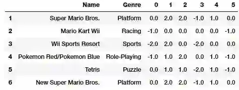 hashed_features = hashed_features.toarray()pd.concat([vg_df[['Name', 'Genre']], pd.DataFrame(hashed_features)], axis=1).iloc[1:7]