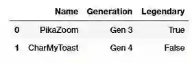 new_poke_df = pd.DataFrame([['PikaZoom', 'Gen 3', True], ['CharMyToast', 'Gen 4', False]], columns=['Name', 'Generation', 'Legendary'])