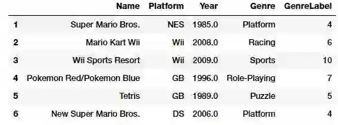 vg_df[['Name', 'Platform', 'Year', 'Genre', 'GenreLabel']].iloc[1:7]
