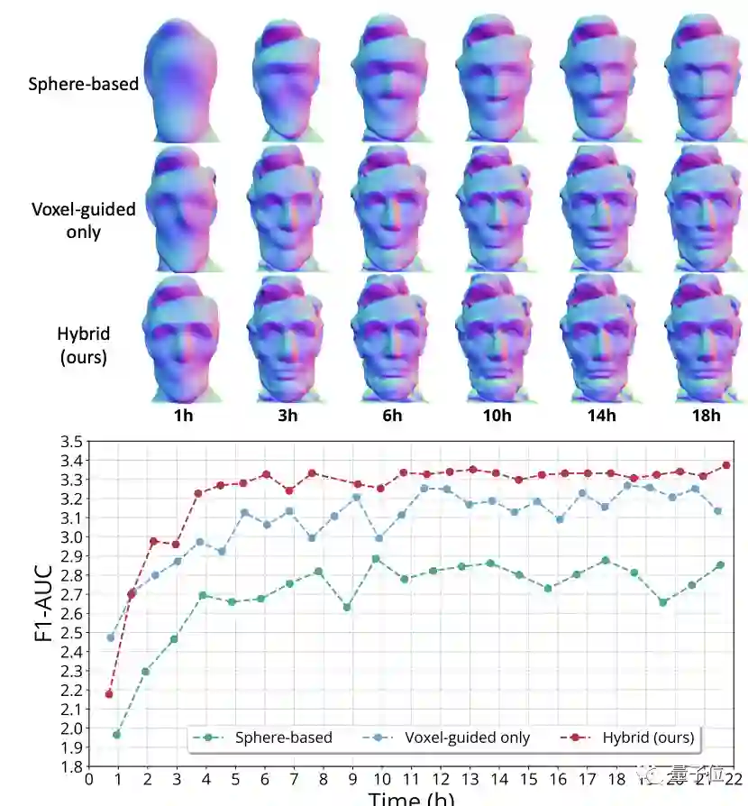 在消融实验中可以看到,仅使用体素引导方法收敛的比基于球体的方法快,但不如混合方法细节丰富。