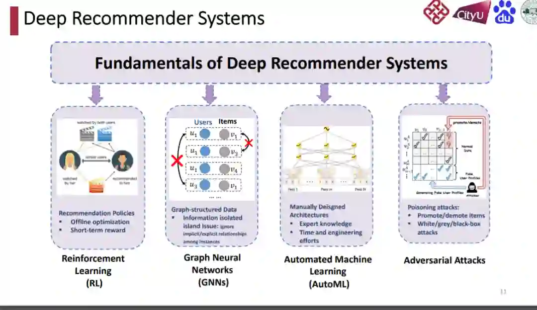 在本教程中,我们旨在全面综述在深度推荐系统中解决上述问题的先进技术的最新进展,包括图神经网络(GNNs)、深度强化学习(DRL)和自动机器学习(AutoML)。同时,我们将为推荐系统引入对抗性攻击。通过这种方式,我们希望来自三个领域的研究人员对空间有一个深入的理解和准确的洞察,激发更多的想法和讨论,并在推荐中推广技术。