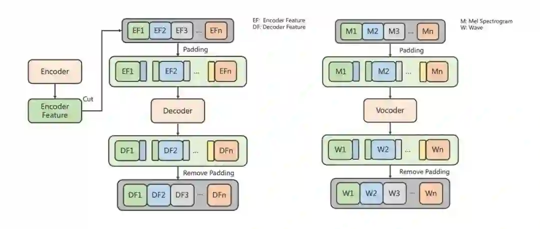 以声学模型 FastSpeech2 、声码器 HiFi-GAN 为例, PP-TTS 对 FastSpeech2 的 Decoder 模块进行了创新,替换了 FFT-Block 为卷积结构,创新性地提出了基于 FastSpeech2 结合 HiFi-GAN 的流式推理结构, 以 Chunk 的方式进行流式推理,可以使声学模型和声码器的输出与非流式推理保持一致。