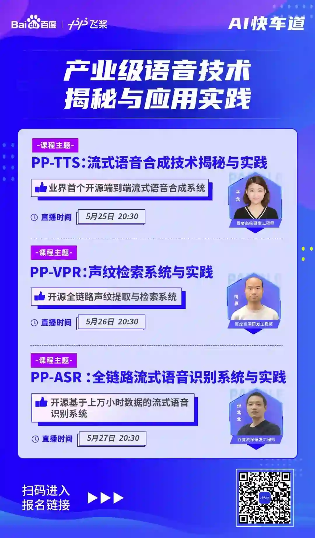 5.25-5.27日每晚20:30,百度资深算法工程师将带来直播课程,详解 PP-TTS 、 PP-ASR 、 PP-VPR 的设计思路和项目实战,欢迎大家扫码进群,获取课程链接!