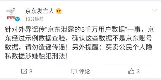 昨日京东官方微博@京东发言人针对外界谣传“京东泄露的5千万用户数据”一事,回应称:这些数据不是京东账号数据,请勿造谣传谣。京东称,经过示例数据查验,确认这些数据不是京东账号数据,另外还提醒:买卖公民个人隐私数据涉嫌触犯刑法。