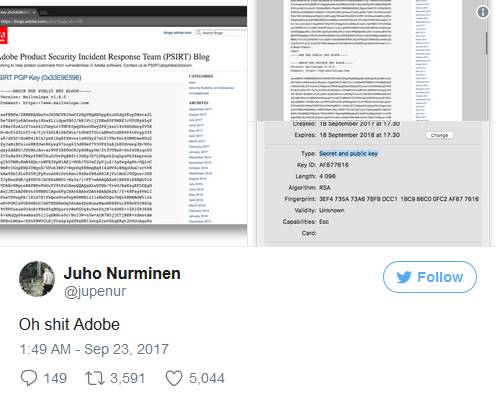 Adobe产品安全事件响应团队(PSIRT)在发布了PGP公共密匙还把私人密匙也公布了出来,这意味着该PGP签名不再安全,获得密匙的人则能借此盗取邮箱的通信内容。