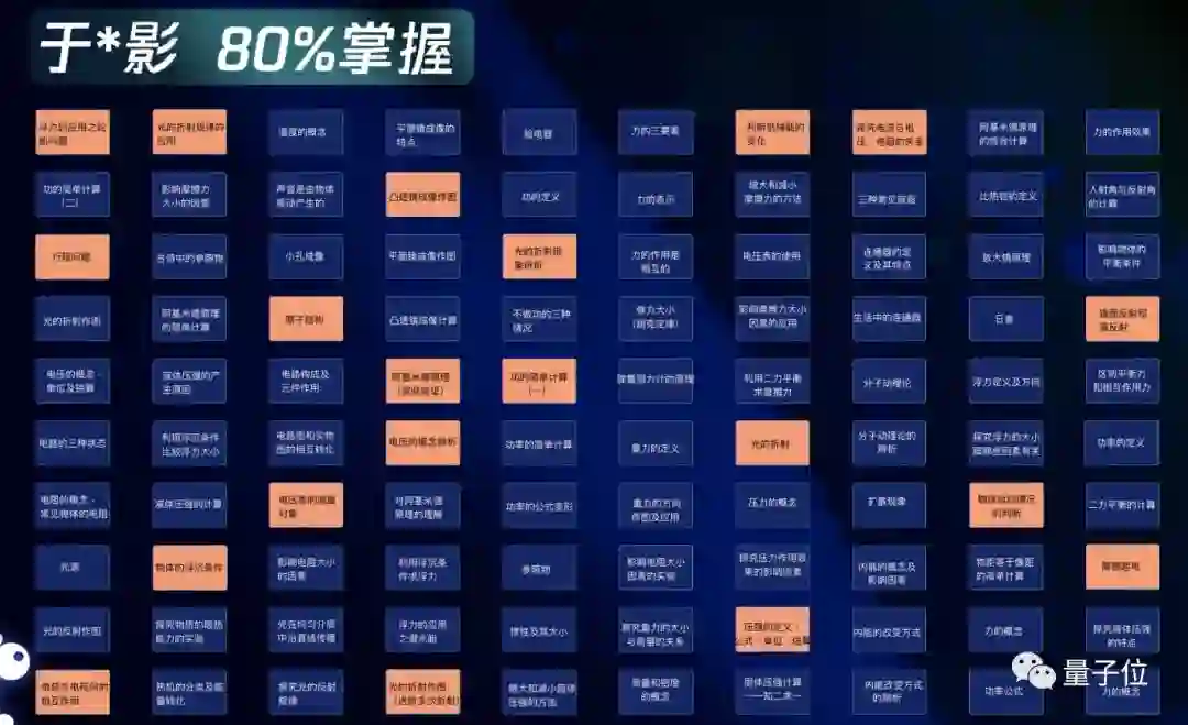首先是学生知识点的掌握。下图是某位松鼠AI学生对物理知识点的熟练掌握程度,可以看到蓝色的部分是该学生已经掌握的部分,占80%;黄色的部分是学生相对 比较薄弱的知识点,占20%。