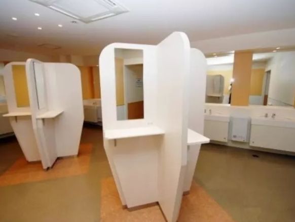 女厕所,镜前是化妆台,意在分流人群,避免有人洗完手继续化妆造成排队。