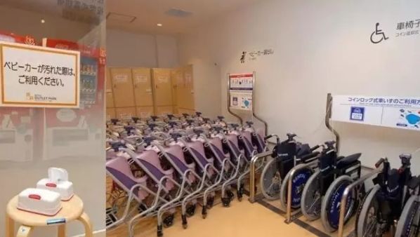 婴儿车和轮椅,就在入口附近,旁边放着消毒纸巾