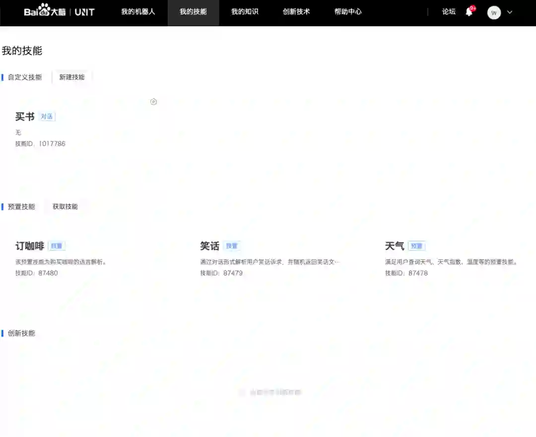 第二层是技能,技能用来完成某个特定的功能。一个机器人可以绑定多个技能。“我的技能”界面如下图所示,可以看出系统预置了一些技能,这些技能一方面可以作为DEMO让用户更快地熟悉这个系统;另一方面可以让用户直接使用,从而更方便地构建出有趣的机器人。点击新建技能,可以发现UNIT把自定义技能分为两种类型:问答型和对话型。其实在NLP圈,这里所谓对话型技能更专业的名字应该叫“任务导向型(task-oriented)问答”,我们今天要体验的就是对话型技能。