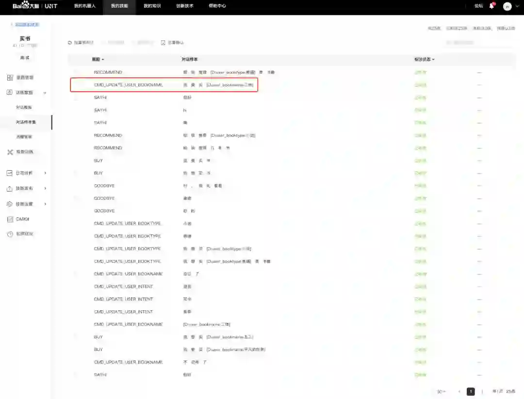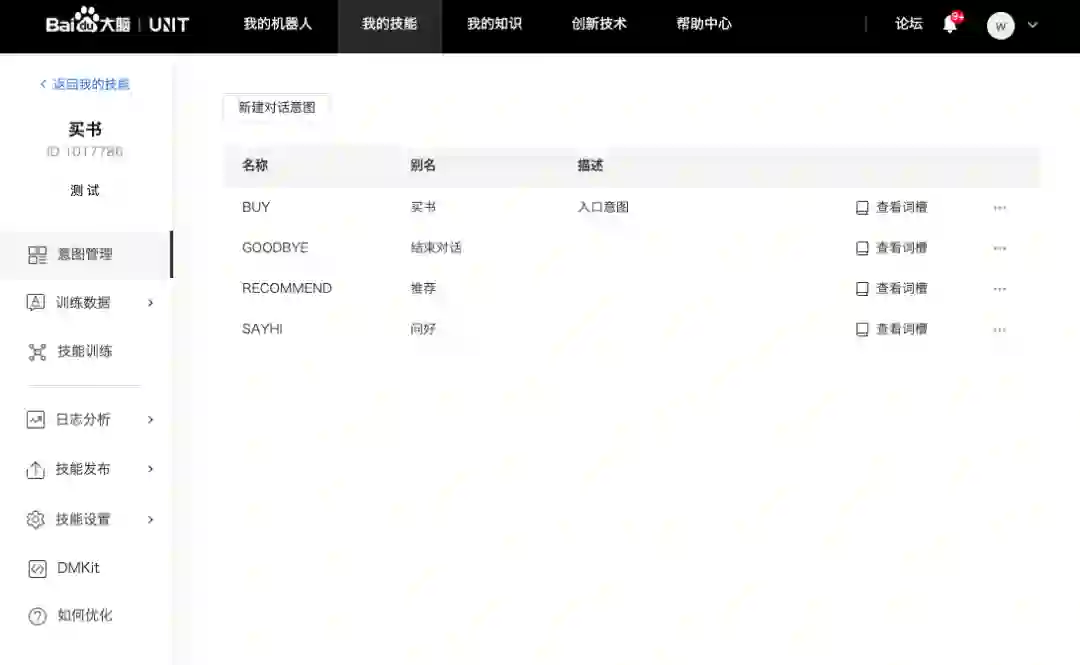 在每个UNIT的对话型技能里,用户可以定义多个意图(intent)。下图是技能编辑的默认界面,管理的就是意图。我个人是比较赞同这种建模逻辑的,要建立一个有效的机器人,必须首先对用户在特定对话空间内表达的意图有完整的把握。