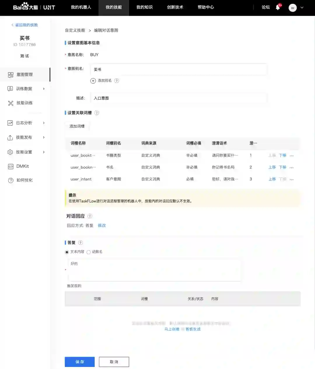 下图是意图编辑界面。在每个意图里,你需要定义它的基本信息、关联词槽和对话回应。
