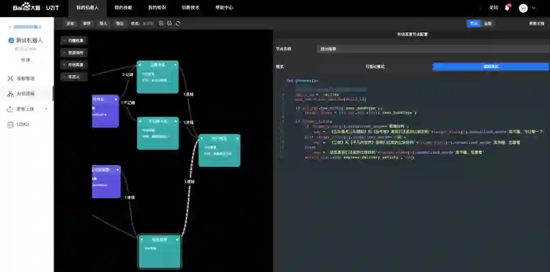 另外再讲一下TaskFlow的自定义代码功能,还是比较方便的,可以很容易实现一些逻辑。通过全局变量可以访问到NLU模块得到的意图和槽信息,下图是我们测试时的例子。