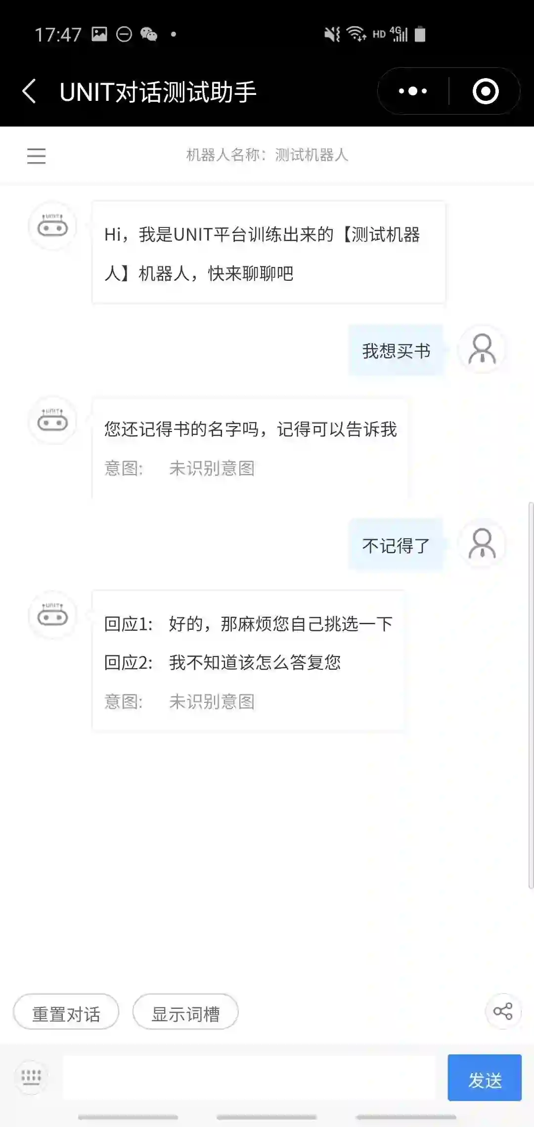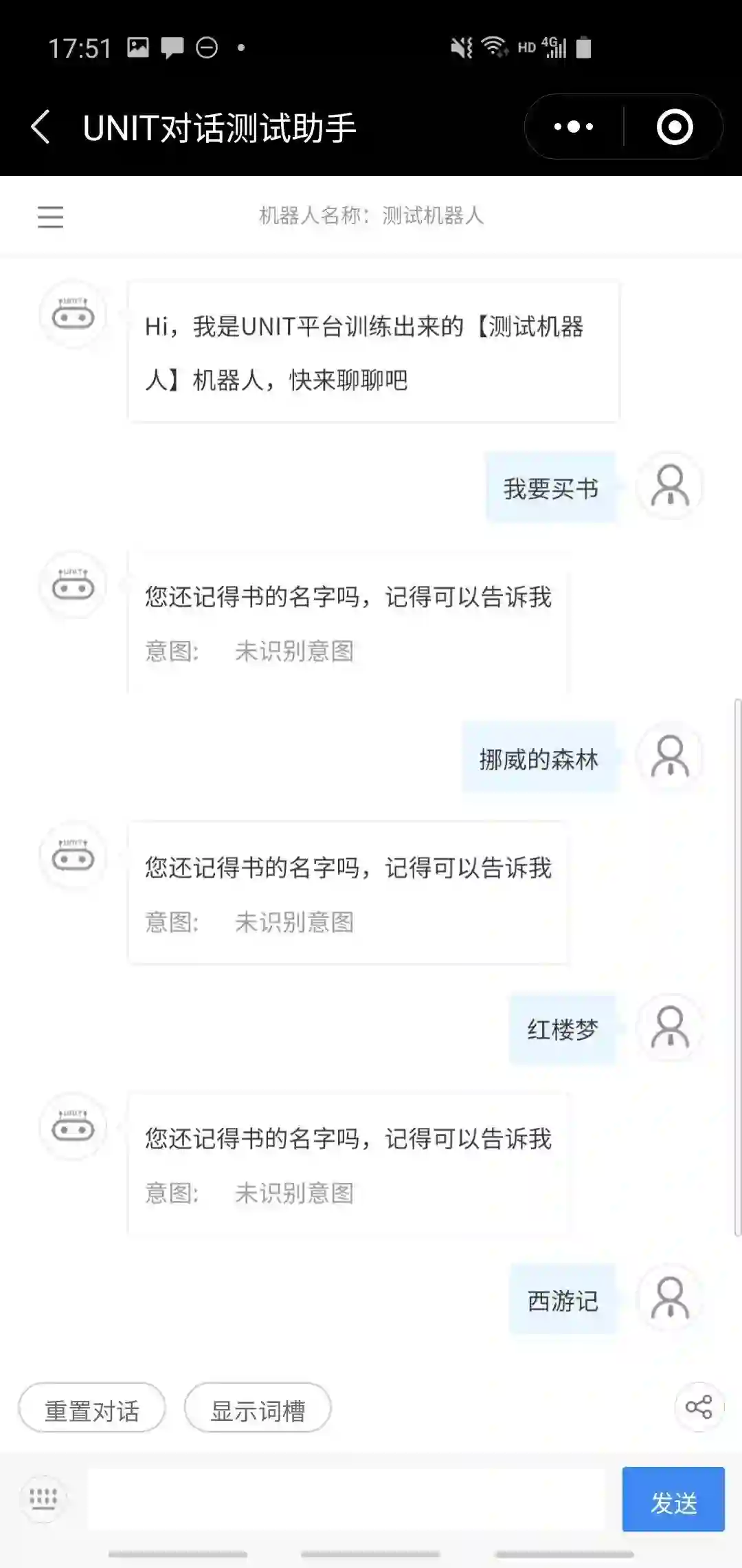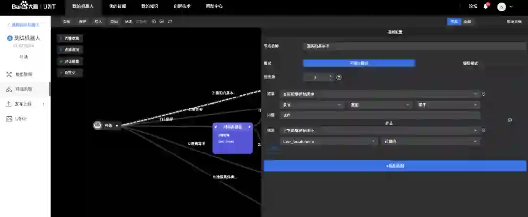 下面是两个失败的案例。左边的例子期望能像最后一个成功案例一样直接进入推荐书节点,但可能是被那个“你好”给干扰了;右边的例子则表面UNIT的slot filling只能识别出词典中已经被定义的词。严格意义上这也不算失败,只是一种策略选择。