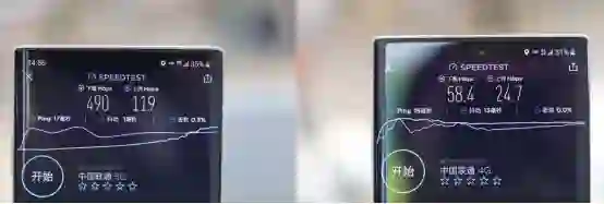 下载峰值 490M/s,上传峰值 119M/s,对比网上其他人的测试结果不算快,可能是联通比移动慢,也可能是基站的问题,但效果依然让我震惊,同一个环境下 5G 的下载速度达到 4G 的 8 倍,上传速度接近 4G 的 5 倍。