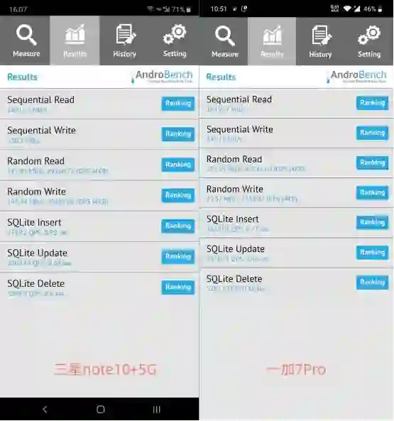 Androbench 测试结果显示,采用 F2FS 文件系统的三星Note 10+ 5G 连续读取 1491.53MB/s,连续写入 530.3MB/s,随机读取 198.81MB/s,随机写入 193.34MB/s。一加7 Pro 连续读取 1443.77MB/s,连续写入 395.71MB/s,随机读取 178.69MB/s,随机写入 29.52MB/s。