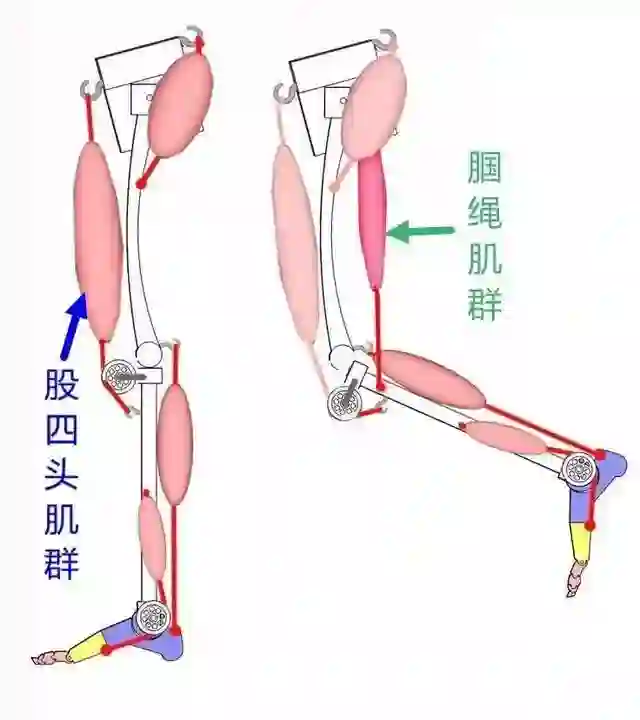 攀爬和直立行走时用到的下肢肌肉很相似,都是在收腿伸腿(两者只是幅度不同,攀爬多增加了蹲起动作)。这其中,大腿部分发挥关键作用的肌肉是,股四头肌肌群(大腿前侧的肌肉)和腘绳肌群(大腿后侧的肌肉),这两组肌肉都是一端连在骨盆上,一端固定在膝关节上,控制着下肢的行走和攀爬。