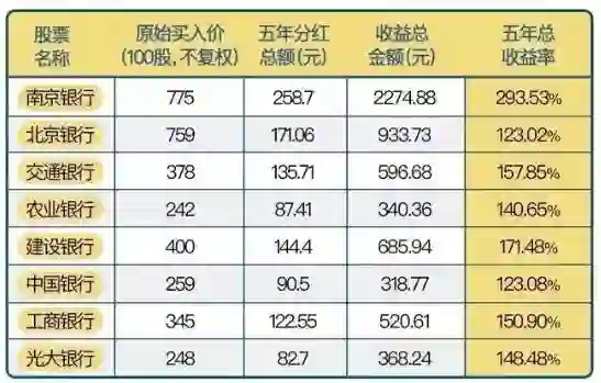 如果五年前,你拿出10万元本金,按照上表,买入分红最多的南京银行,五年以后这10万块能带来29万的收益,买入工商银行、建设银行、农业银行、中国银行、交通银行这样的大盘蓝筹,也能带来12万-17万的收益。
