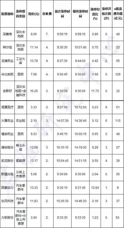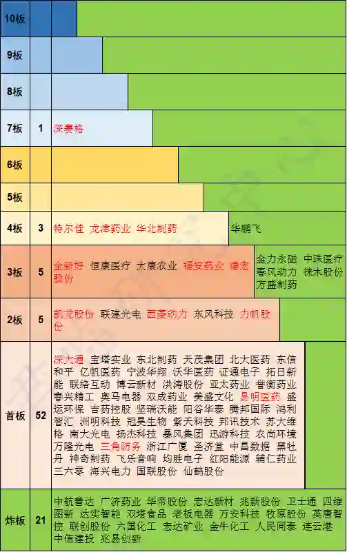 图中标的剔除新股和ST,绿色背景为炸板或进阶失败个股,其他颜色背景为对应高度涨停个股。红色字体为主观选择的对应高度核心股,每个高度不超过三只,便于观察市场情绪变化和结构走向,非投资建议。