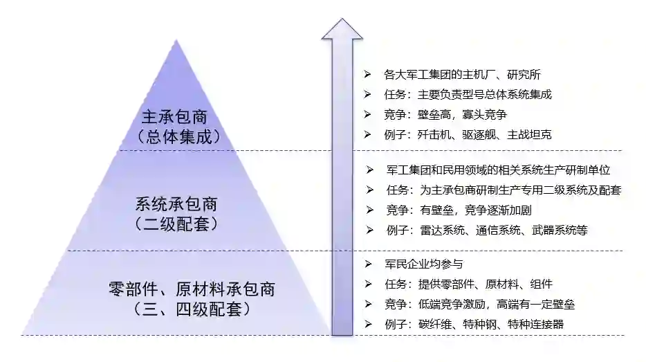 国防军工常见的产业链划分体系为:1、主承包商(总体集成);2、系统承包商(二级配套);3、零部件、原材料承包商(三、四级配套)。