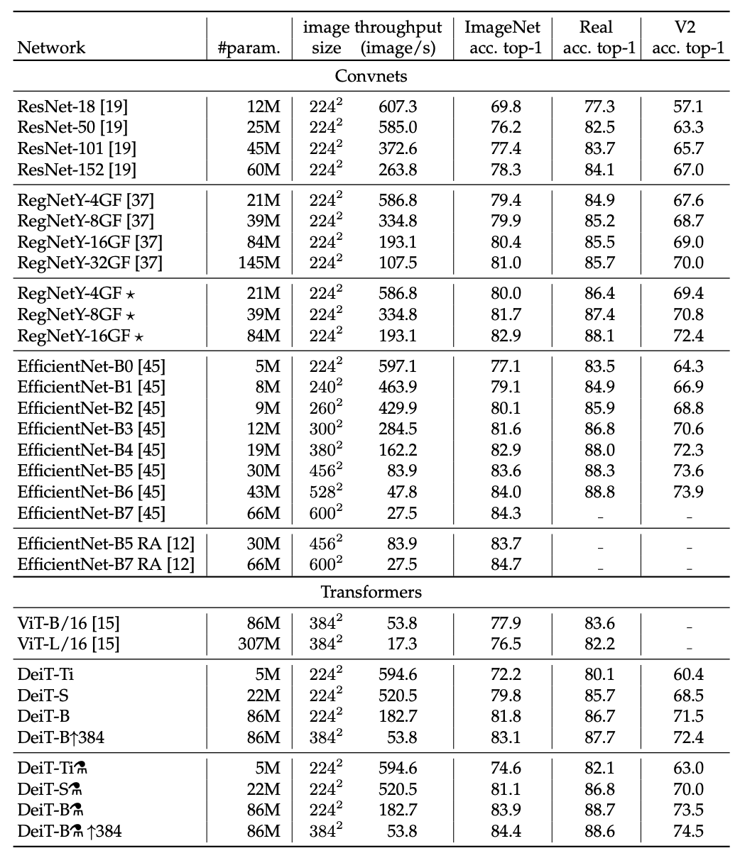 表 1:DeiT 架构变体。DeiT-B 是其中较大的模型,架构与 ViT-B 相同,但是训练策略和蒸馏 token 不同;DeiT-S 和 DeiT-Ti 是两个较小的模型。