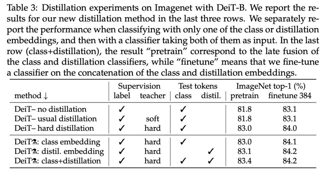 该研究提出的蒸馏策略进一步提升了性能,表明 class token 和蒸馏 token 能够提供对分类任务有用的补充信息:基于这两个 token 的分类器性能显著优于单独的 class 分类器和蒸馏分类器,不过单独的分类器依然超过了蒸馏基线方法。