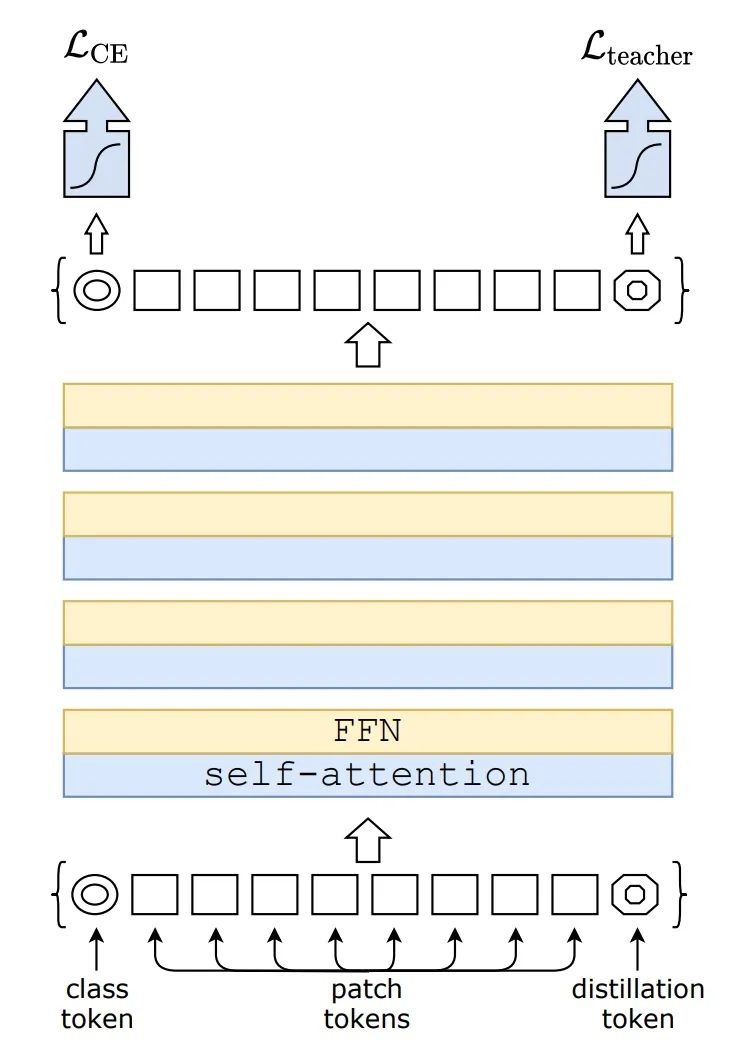 在测试时,Transformer 生成的类或蒸馏嵌入与线性分类器相联系,并能够推断出图像标签。