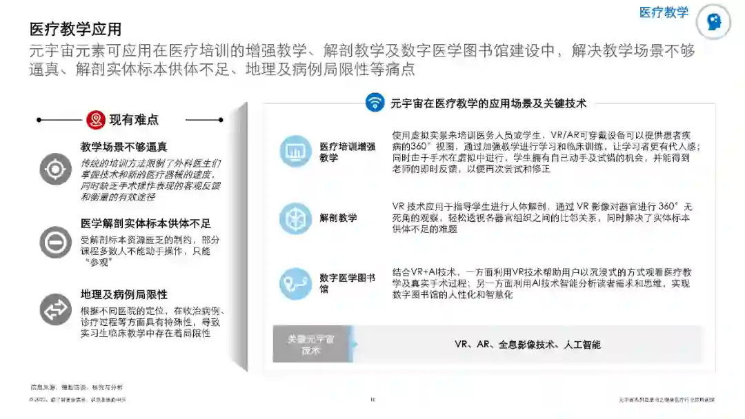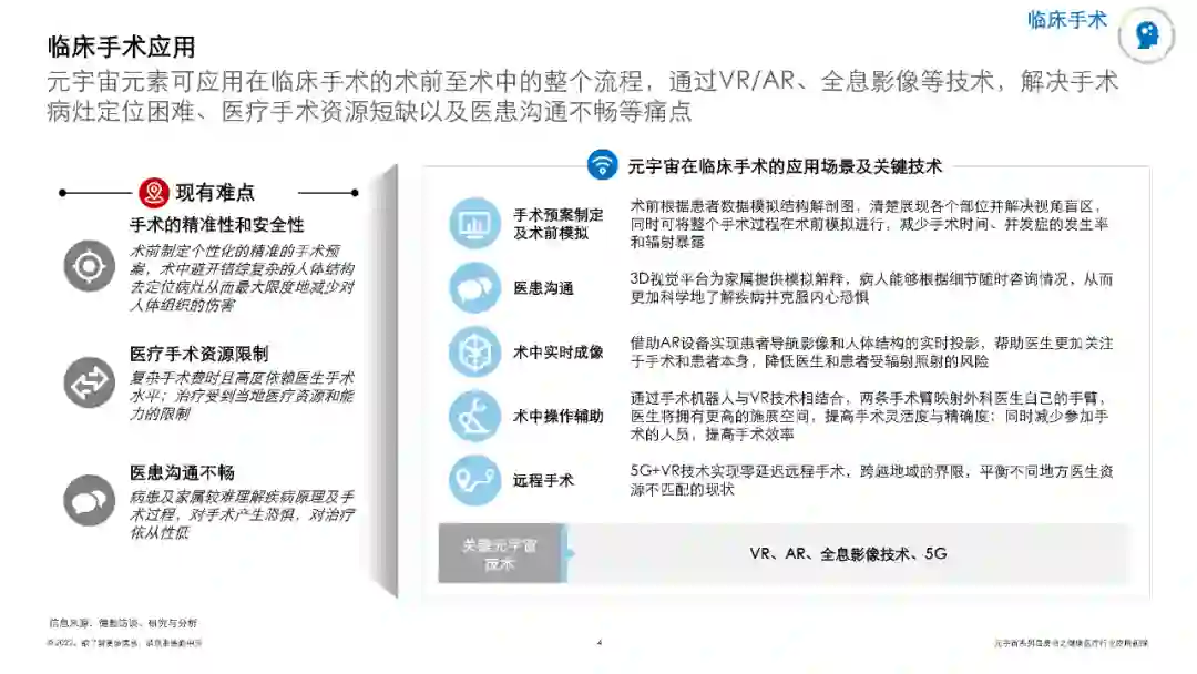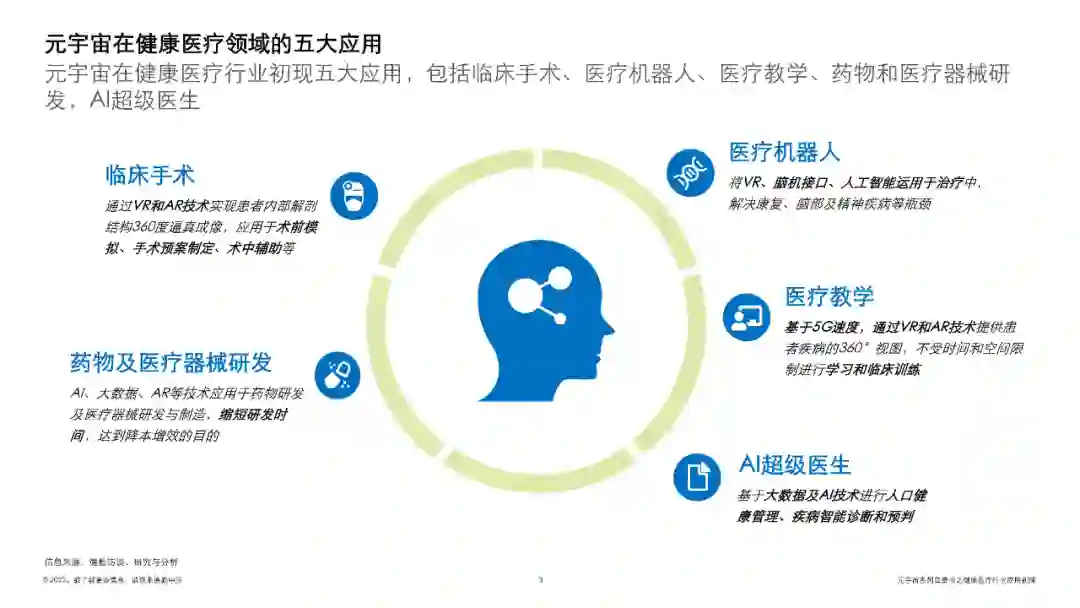 白皮书列举出了临床手术、医疗机器人、医疗教学、药物及医疗器械研发和AI超级医生等元宇宙在医疗健康领域的五大应用概况及其案例。