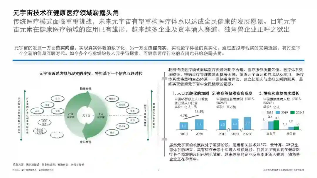 我国传统医疗模式面临医疗资源利用不合理、医疗服务质量欠佳、医疗体系效率较低、慢病诊疗管理覆盖面低等困境。随着元宇宙元素的出现及应用, 医疗体系或将重构生态体系——围绕患者体验,建立起现实与虚拟之间的联系,最终实现健康元宇宙中全民健康的愿景。虽然元宇宙的发展尚处于萌芽阶段,随着相关技术如5G、云计算、XR及生态体系的培育,其有望在未来十年进入成熟阶段。目前元宇宙元素在健康医疗各个领域的应用已初见雏形,越来越多的企业及资本正涌入赛道,独角兽企业正在孕育中。
