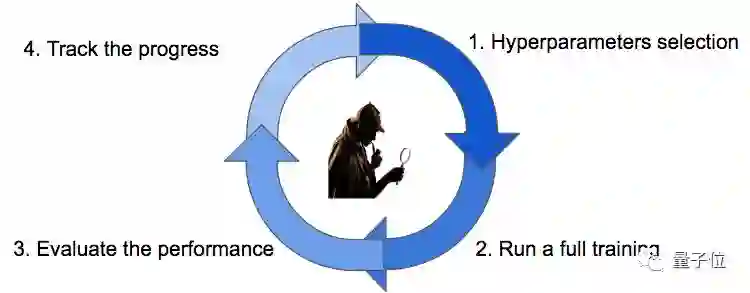 从一个有潜力的配置的猜测(步骤1 )开始,等到一次完整的训练(步骤2 )结束后,来获得对相关有益度量的实际评估(步骤3 )。然后,我们将跟踪搜索过程(步骤4 ),再根据我们的搜索策略,选择新的猜测(步骤1 )。