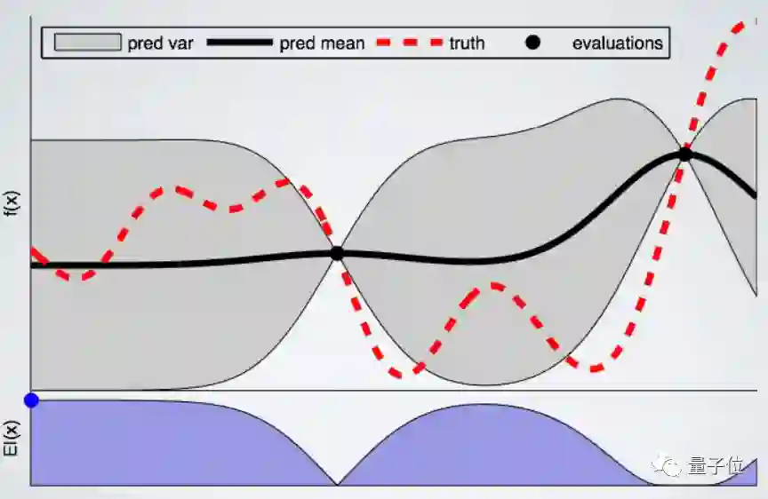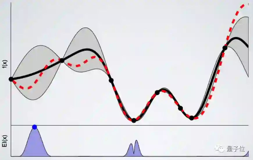 在这个例子中,我们使用了Expected Improvement:如果我们使用不确定性区域中的推荐配置,这个函数的目的是为了找到尽可能低的值。