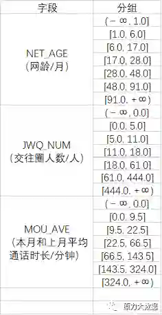 如表中网龄NET_AGE字段,网龄小于28个月的分组WOE值都为正,表明网龄小于28个月的客户更有可能被判定为流失客户,网龄越小,WOE数值越大,表明可能性也越大。