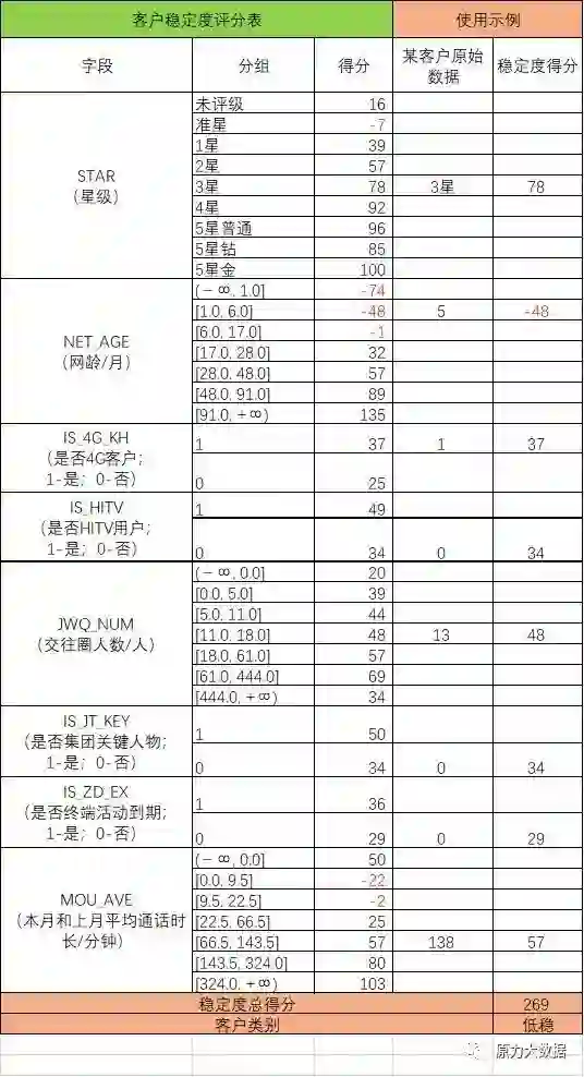 使上述评分表(表6)可对客户进行稳定度评分,通过该客户各个特征字段的得分加总,最终可得到客户的最终稳定度得分。如以下例子所示: