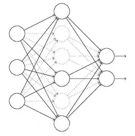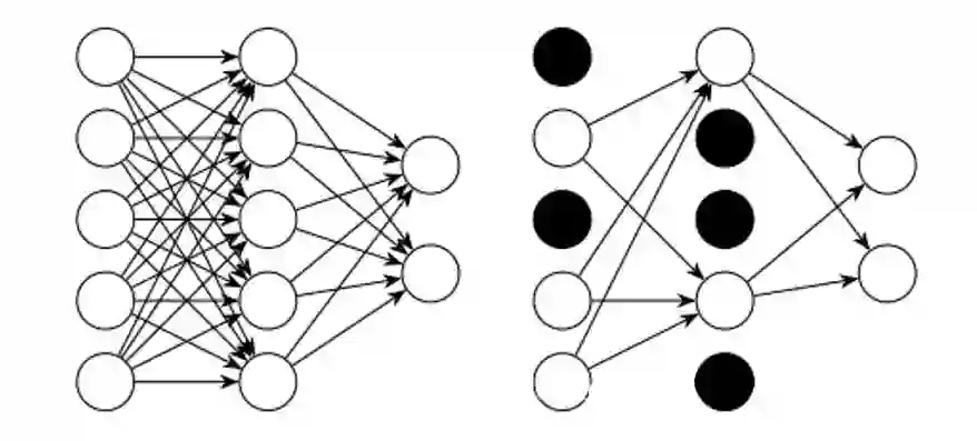 假设我们要训练上图这个网络,在训练开始时,我们随机地“删除”一部分的隐层单元,视它们为不存在。