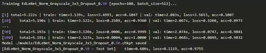 我们尝试过不同的参数,但最终结果是_p-conv = 0.75_和_p-fc = 0.5_,这使得我们可以使用3x3的模型在归一化灰度图上实现97.55%的测试集准确率。有趣的是,我们在验证集上的准确率达到了98.3%以上:
