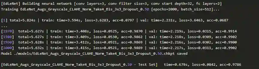 该网络由3个卷积层组成,内核大小为3x3,下一层的深度加倍,使用ReLU作为激活函数,每一层的后面是最大2×2的池操作。最后3层完全连接,最后一层能产生43个结果(可能的标签总数),使用SoftMax作为激活函数。这个网络使用附带Adam优化器的迷你批次随机梯度下降算法进行训练。我们编写了高度模块化的基础代码,这使得我们能够_动态_创建模型,示例代码片段如下: