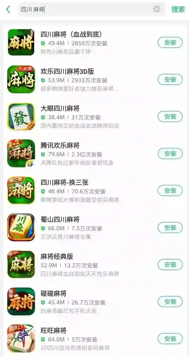 其结果,就是地方类棋牌游戏竞争格外激烈,尤其在四川等棋牌游戏氛围最浓厚的地方。即便到今天,在手机的应用商店中搜索“四川麻将”这一关键词,都能出现10款以上同类型的棋牌游戏,但这些游戏又都十分雷同,毫无特色。因此,如何动用本地的资源收获更多的用户,就是成功的关键。